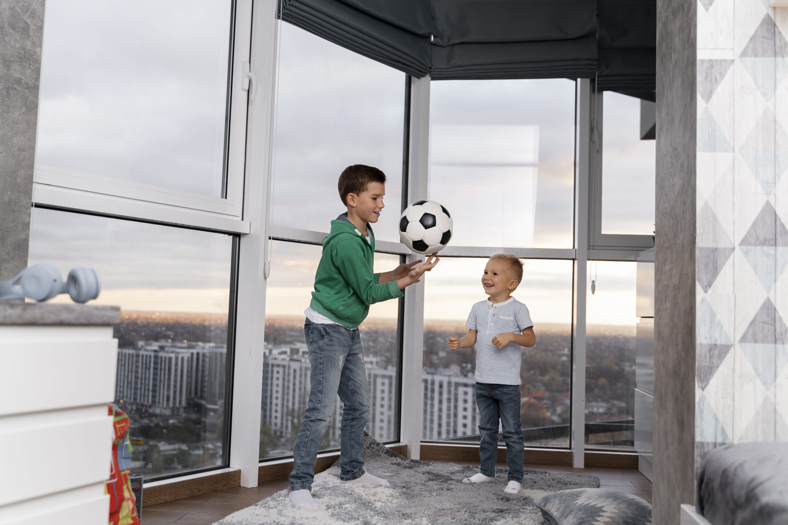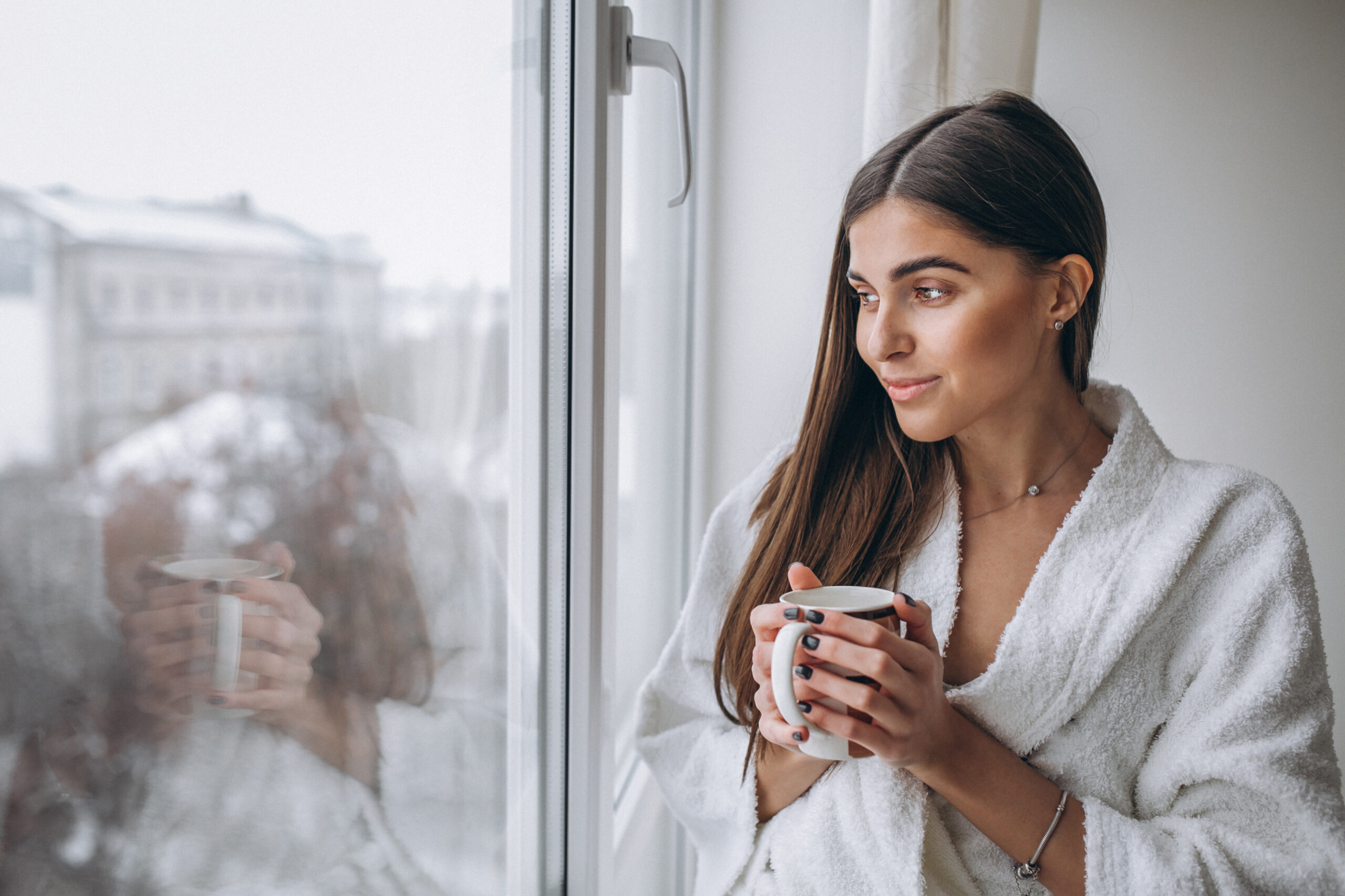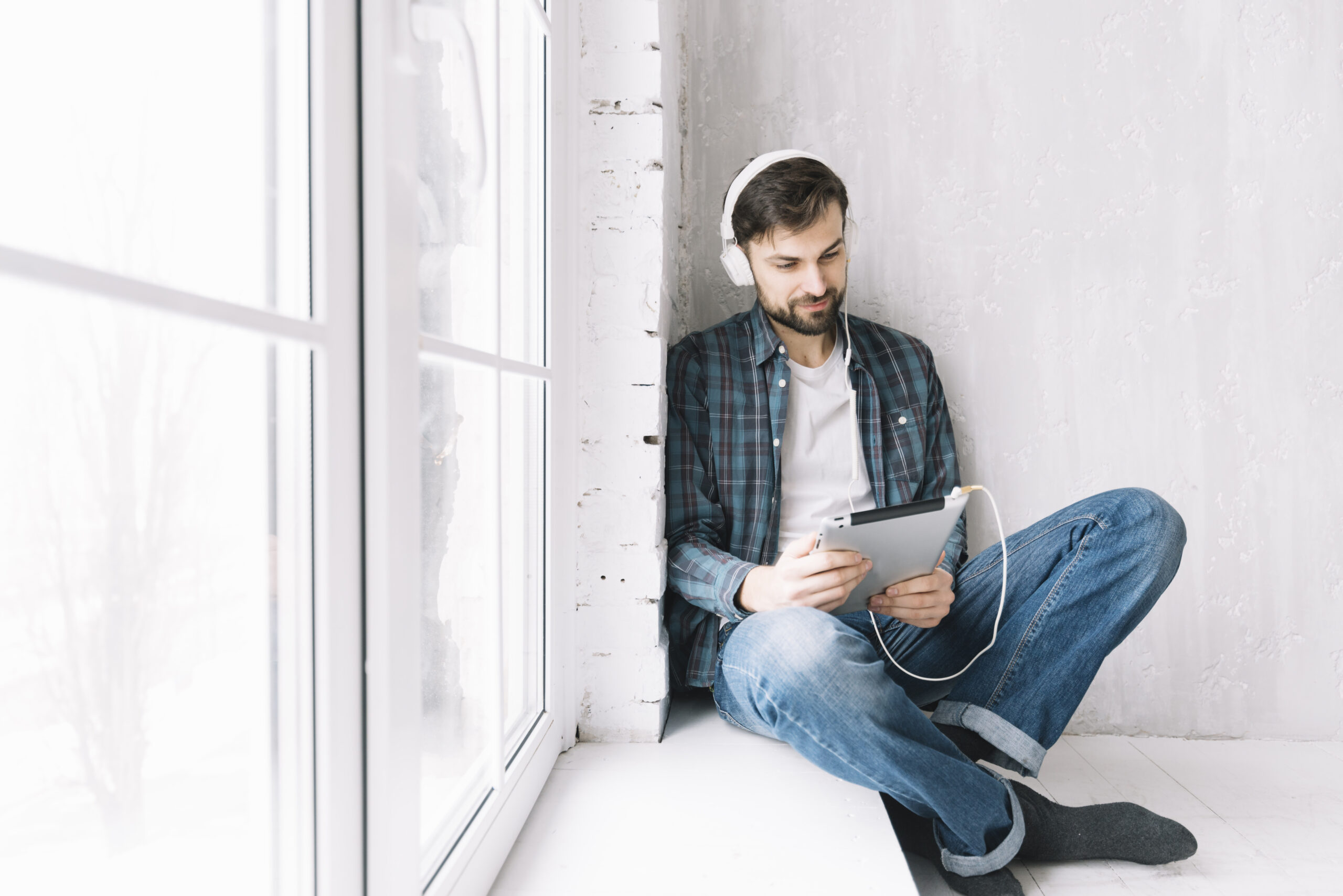 Cute ginger lady in jeans sitting on sill and listening music. P