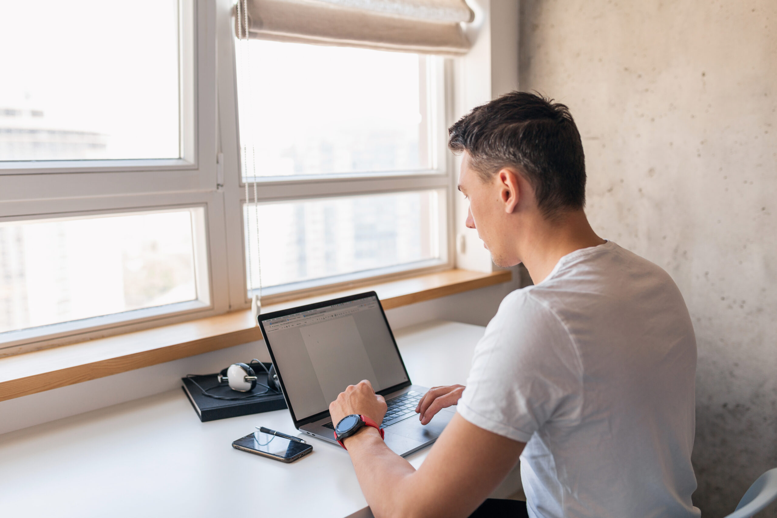 young handsome man in casual outfit sitting at table working on laptop, freelancer at home, view from back